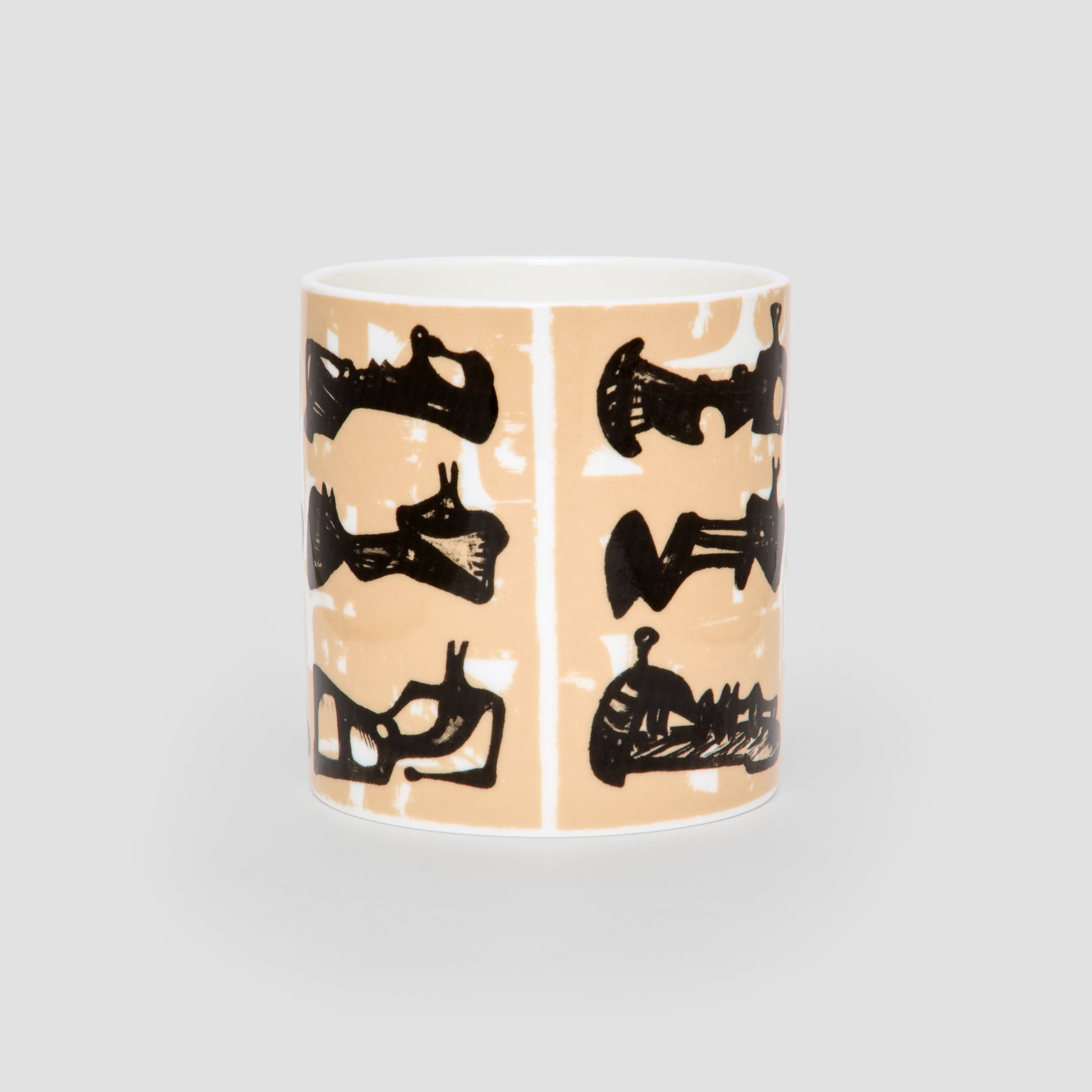 A beautiful fine bone china mug featuring a printed design in blues and black, inspired by Henry Moore's Six Reclining Figures with Buff Background 1963.
