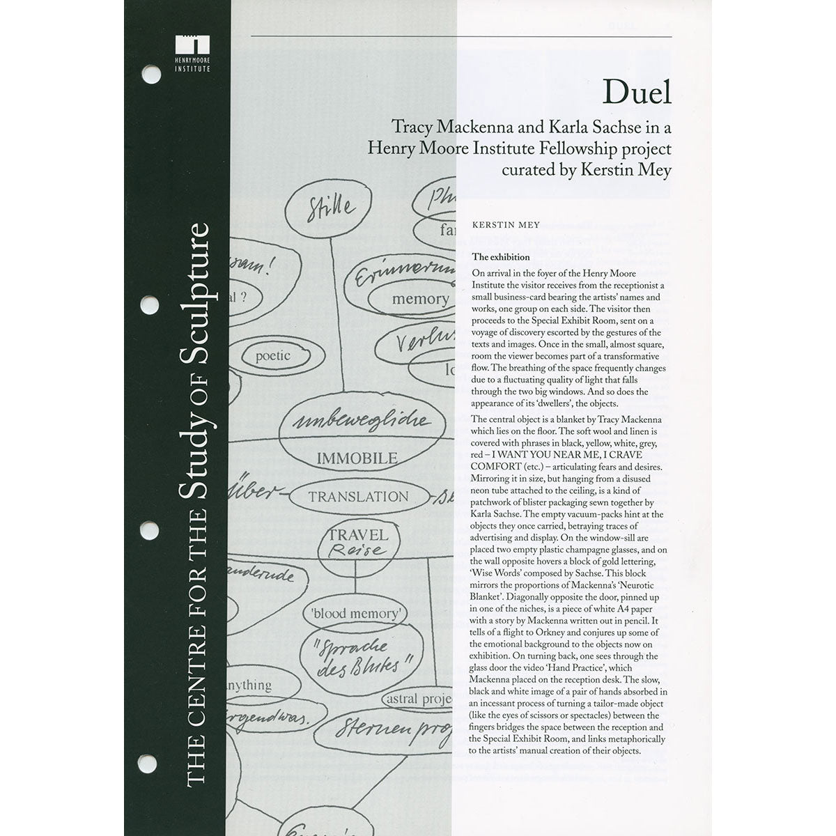 Duel documents the results of Kerstin Mey's Henry Moore Institute Fellowship, where she invited the artists Tracy Mackenna and Karla Sachse to respond to each other, within a given space, context and time frame. For five days, Gallery 4 at the Institute became a laboratory, a receptive space, in which these artists 'dueled' through their working practices.